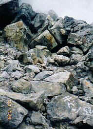 すぐ脇にルートを示すペンキマークが。 一体どうすりゃいいんだと躊躇しまくり。 かなかった。と言っているにも関わらずしっかりパンを食べたけど(^_^;)。 でも硫黄くさくてなんだかゆで卵を食べている気分。 |